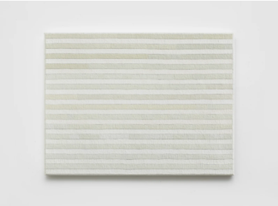 21 pieces from Zhao’s A Few Ordinary Parallel Lines series (2022 – 2025) – small, intimate paintings that feature rows of predominantly white, off-white, or pale grey strips. Each row is made up of many small shards – these are in fact tiny pieces of eggshells.